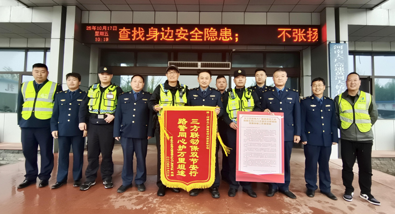 2025 年 10 月 17 日,新鄉市公安局交通管理支隊大廣高速大隊主要負責同志專程到訪大橋公司,冒雨送來感謝信與錦旗,對公司在本年度防汛搶險及“國慶·中秋”雙節保通工作中的突出貢獻予以書面表彰。此次致謝不僅是對大橋公司在防汛關鍵期、國慶中秋雙節保通任務中專業擔當的高度肯定,更彰顯了警企攜手守護道路安全的堅實成果,為雙方深化合作注入新動力。