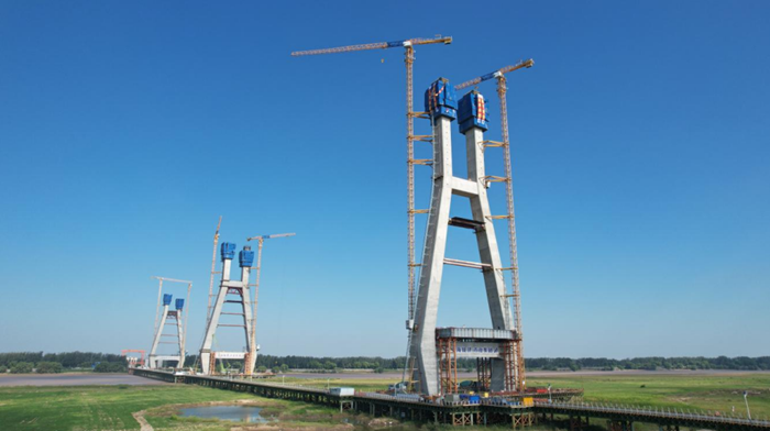 蘭封高速東壩頭黃河大橋主橋全長9104米,主橋采用主跨140+360+360+140米的鋼混組合梁三塔斜拉橋設(shè)計(jì),塔柱外形為中原鼎型結(jié)構(gòu),主橋中塔89#墩高達(dá)160.5米,分27個(gè)節(jié)段進(jìn)行澆筑;兩座邊塔88#墩、90#墩均為154.3米,分26個(gè)節(jié)段進(jìn)行澆筑。歷經(jīng)12個(gè)月的日夜奮戰(zhàn),蘭封高速黃河大橋88#墩主塔26個(gè)節(jié)段的施工任務(wù)提前兩個(gè)月完成。